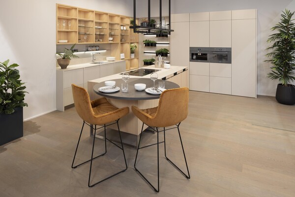 Schon mitbekommen, dass Rundungen der neue Trend im Küchendesign sind? Aber muss man deswegen gleich die vorhandenen Küchenmöbel austauschen? Keinesfalls! Hier ist eine schöne Gestaltungsidee, die wir auf der Messe entdeckt haben und die zeigt, wie gut rund und eckig zusammenpassen: mit einem kreisrunden Ansatztisch an der Küchentheke oder Kücheninsel.