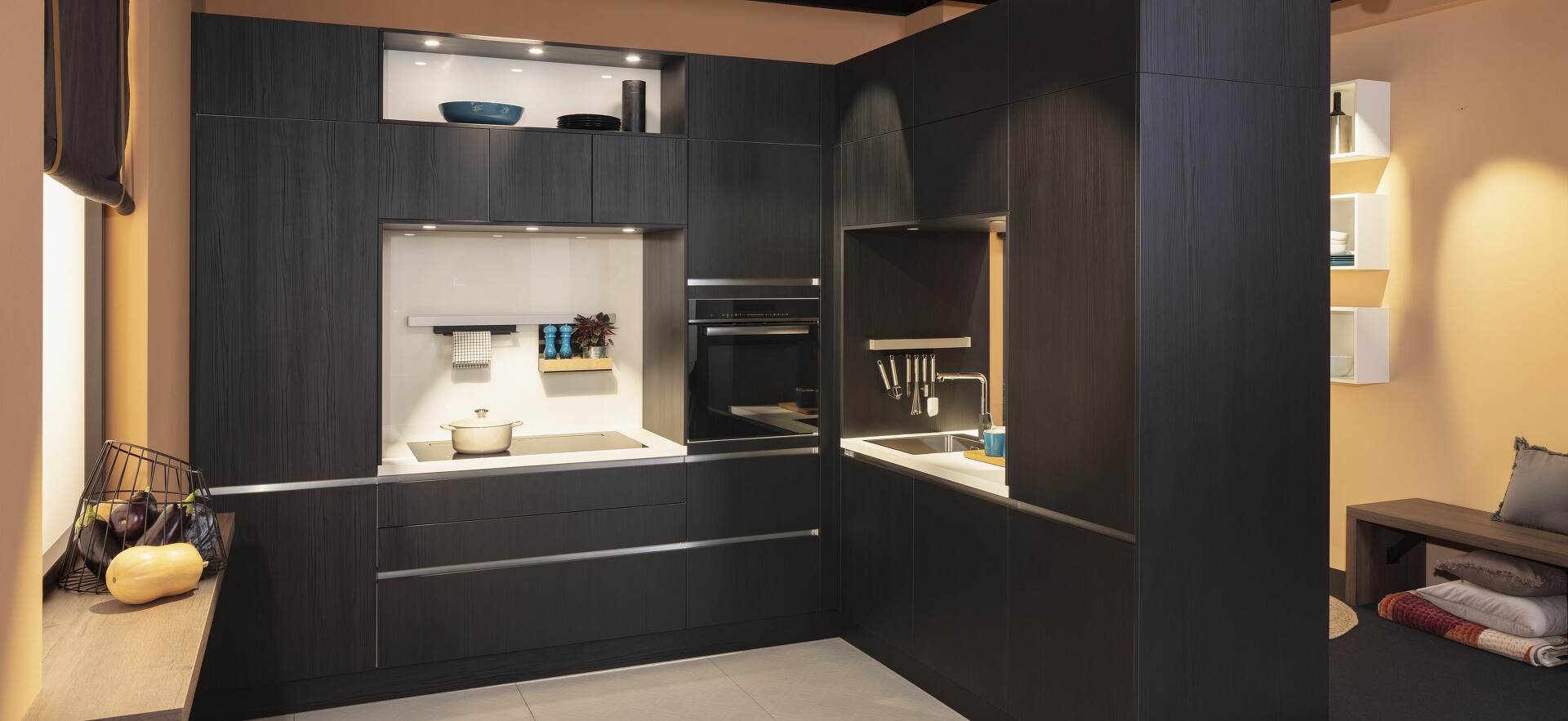 Statt dafür Trockenbauwände zu ziehen, können solche Aufteilungen auch per Küchenzeile geschaffen werden. Beim hier gezeigten Beispiel wurde die eine Seite einer L-Küche nicht erst in der Zimmerecke abgewinkelt, sondern vorher. So ragt sie frei in den Raum und unterteilt ihn damit. Es entsteht eine von der Küche abgegrenzte Wohnzone mit praktischer Durchreiche im Spülenbereich.