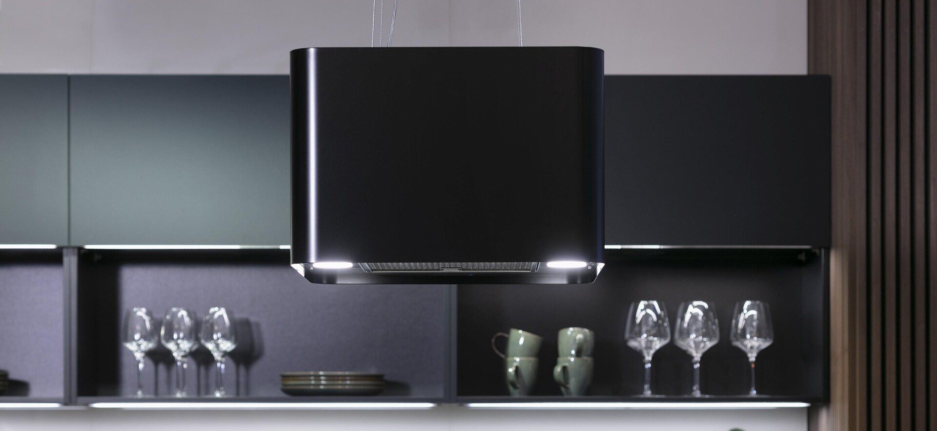 Wie eine Designer-Decken erscheint diese Inselhaube, und das ist volle Absicht und zugleich Bestandteil ihrer Funktionalität: Die von der Decke hängende Dunstabzugshaube kann Stimmungs- und Arbeitslicht und zugleich alles einsaugen, was an Kochwrasen und Bratdämpfen aufsteigt.